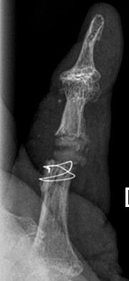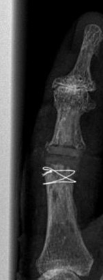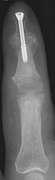 Blickfang ist hier das x-förmige Implantat zur Versteifung eines schmerzhaften und ehemals deformierten Endgelenkes.