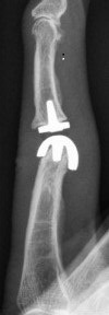 Im Mittelgelenk fällt ein flauer "Schatten" von einem Kunstgelenk aus Silikon (Silikonendoprothese) auf.